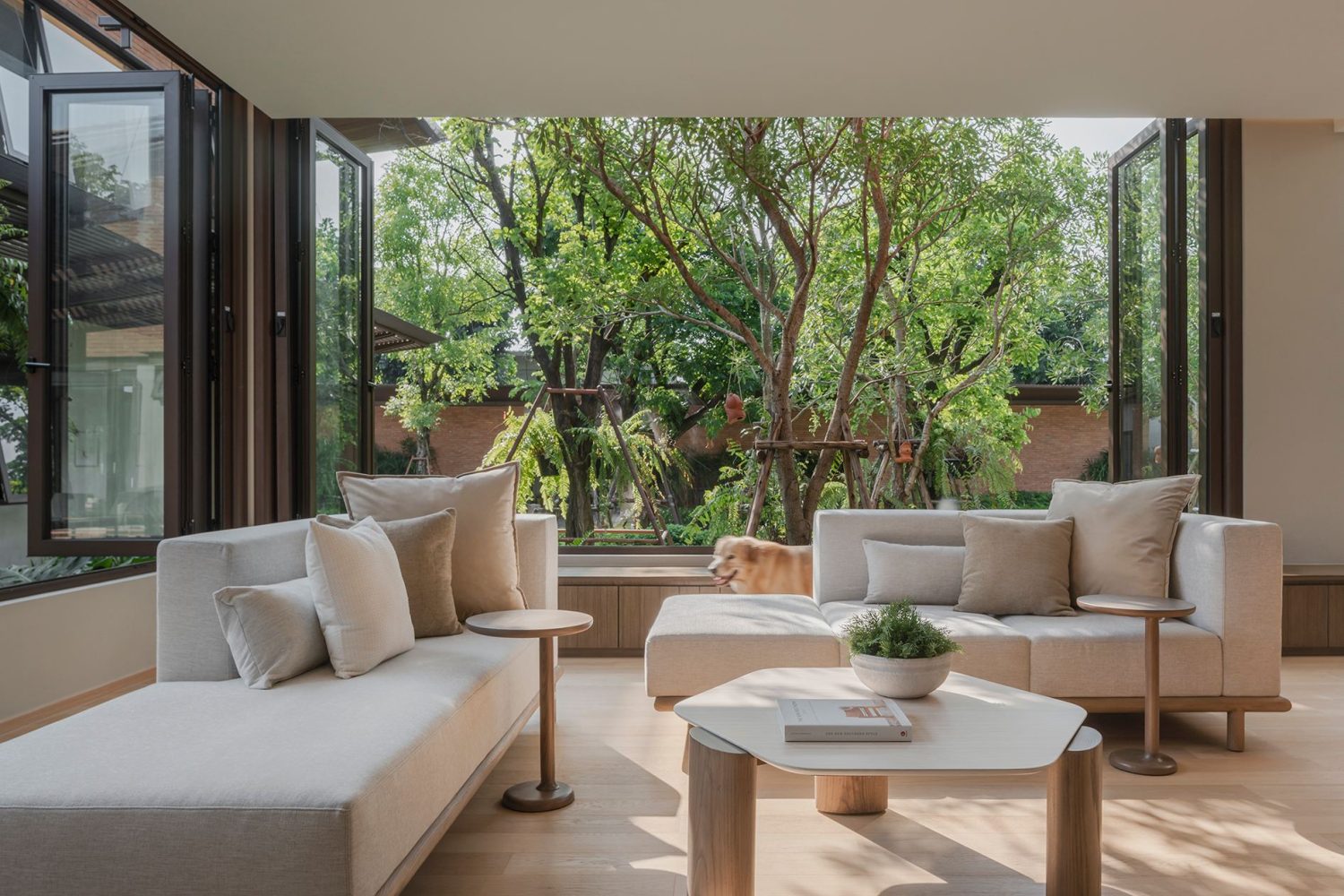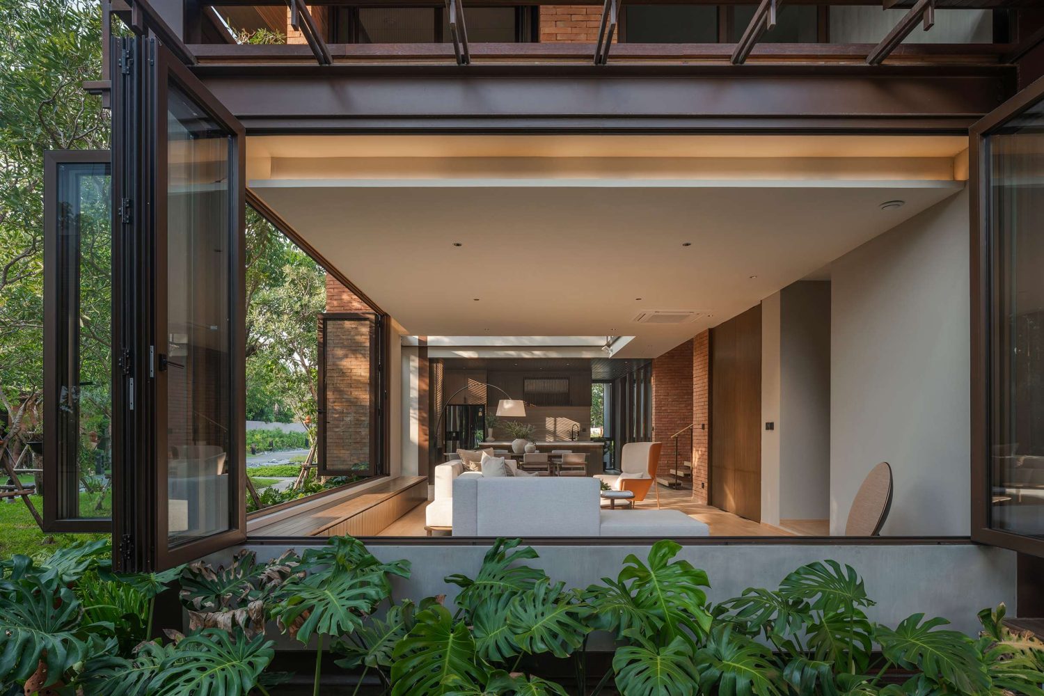 The house is defined by its fluid connection between indoors and outdoors. Large folding glass doors open the living and dining areas to the garden, allowing sunlight and shadows to animate the interior throughout the day. The open-plan layout enhances interaction and visual continuity, while private areas are tucked away to maintain tranquility and comfort.