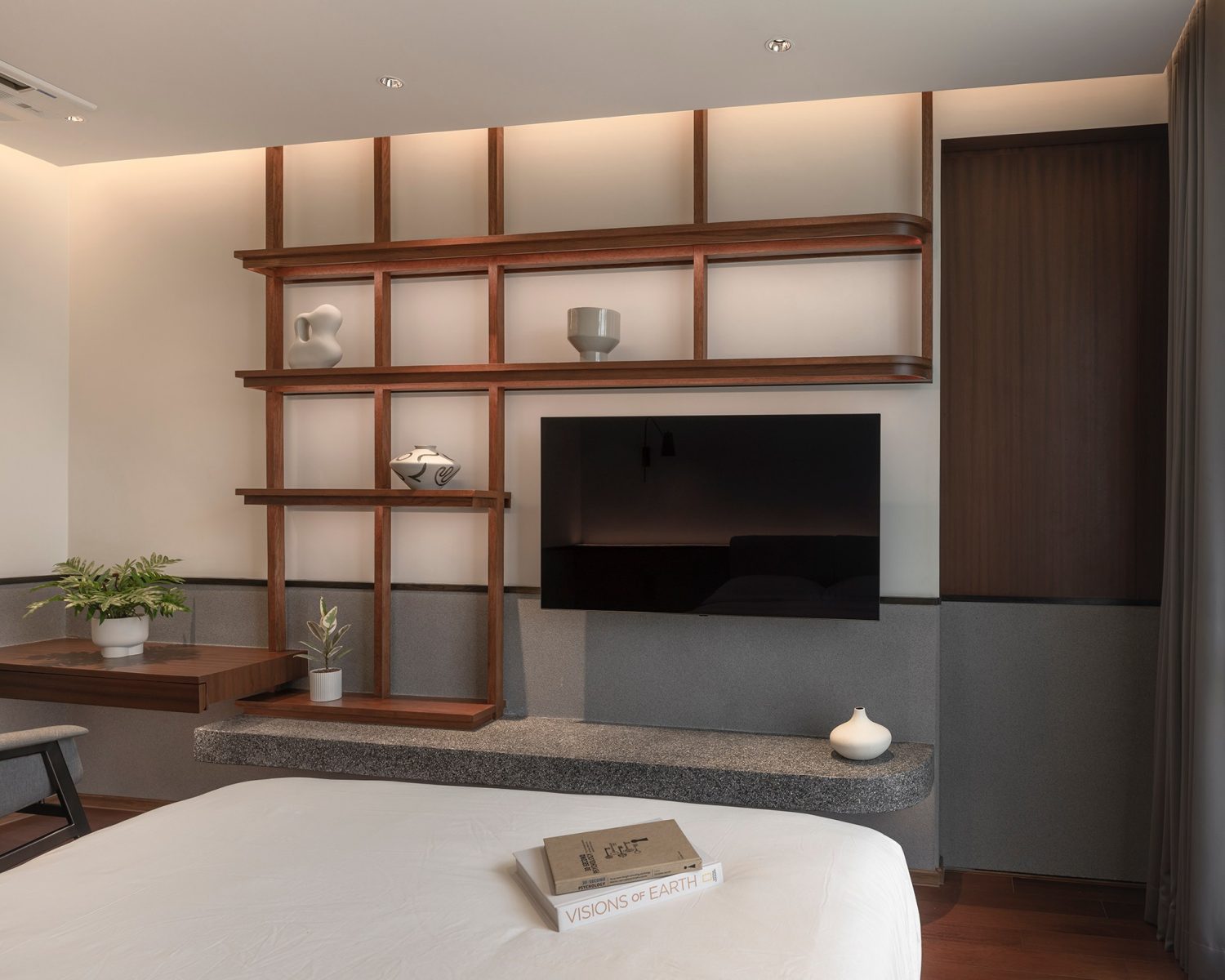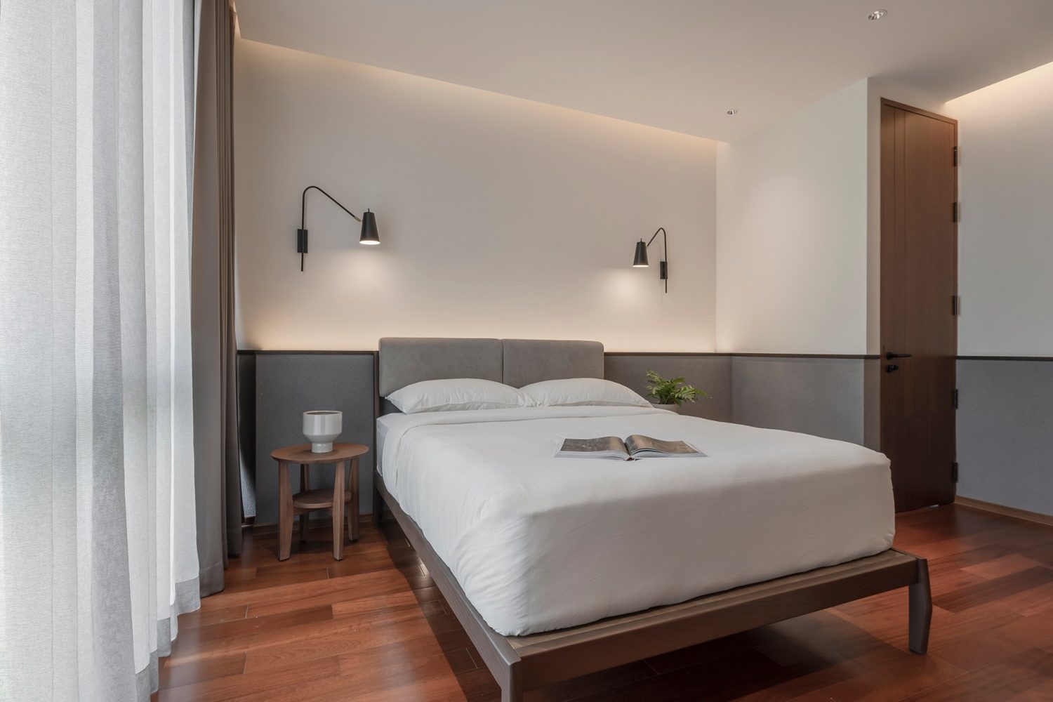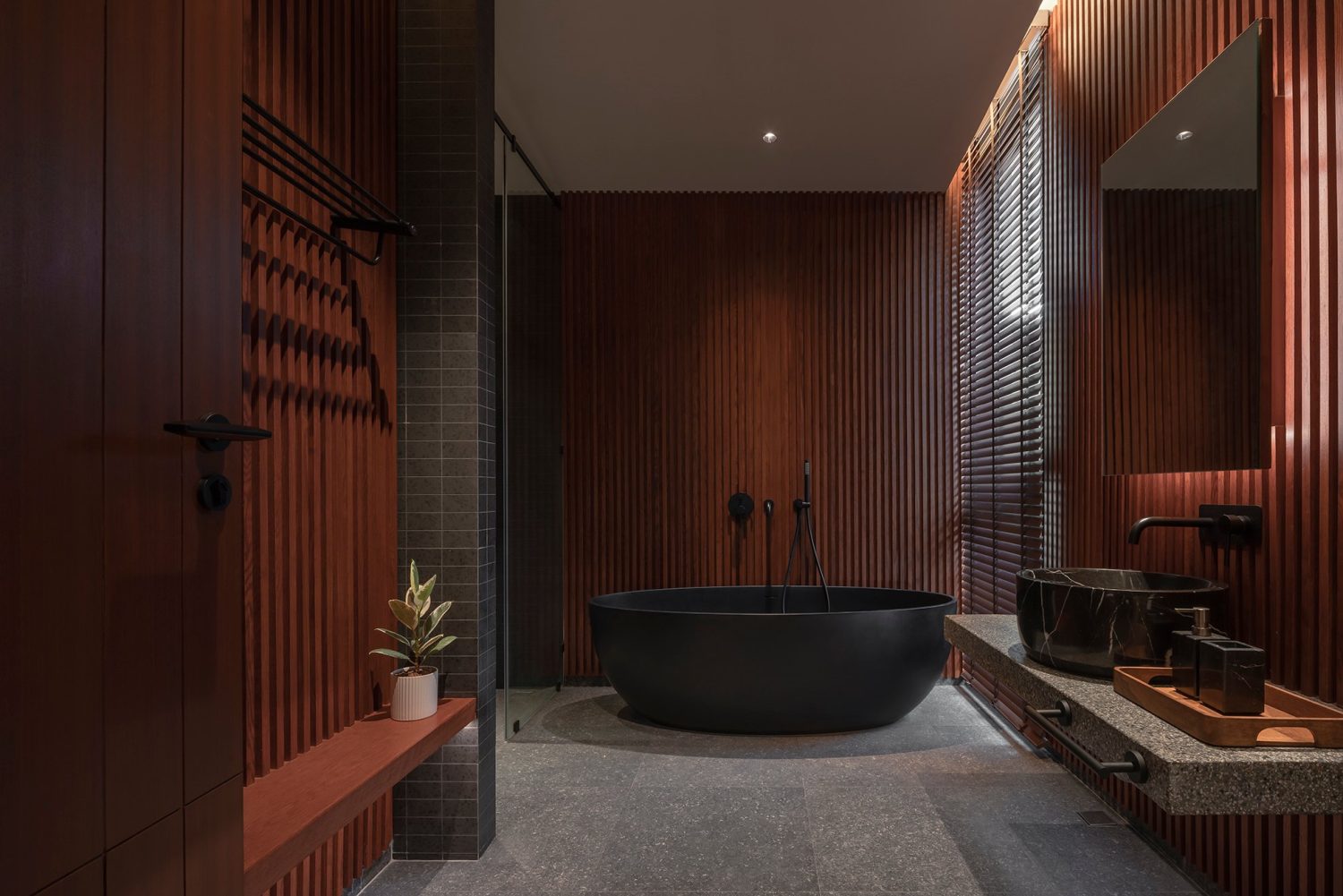 The private areas continue the language of calm restraint. The bedrooms are minimal yet inviting, layered with warm wood and soft fabrics. The bathrooms embrace contrast, pairing light and dark materials to define zones of relaxation. A freestanding bathtub set against rich textures becomes a sculptural centerpiece, reinforcing the idea of everyday retreat.