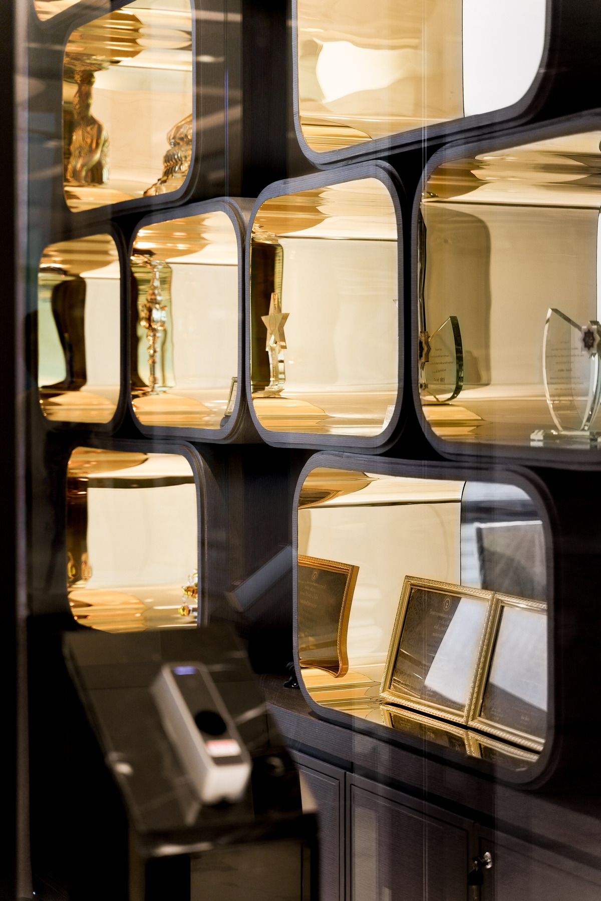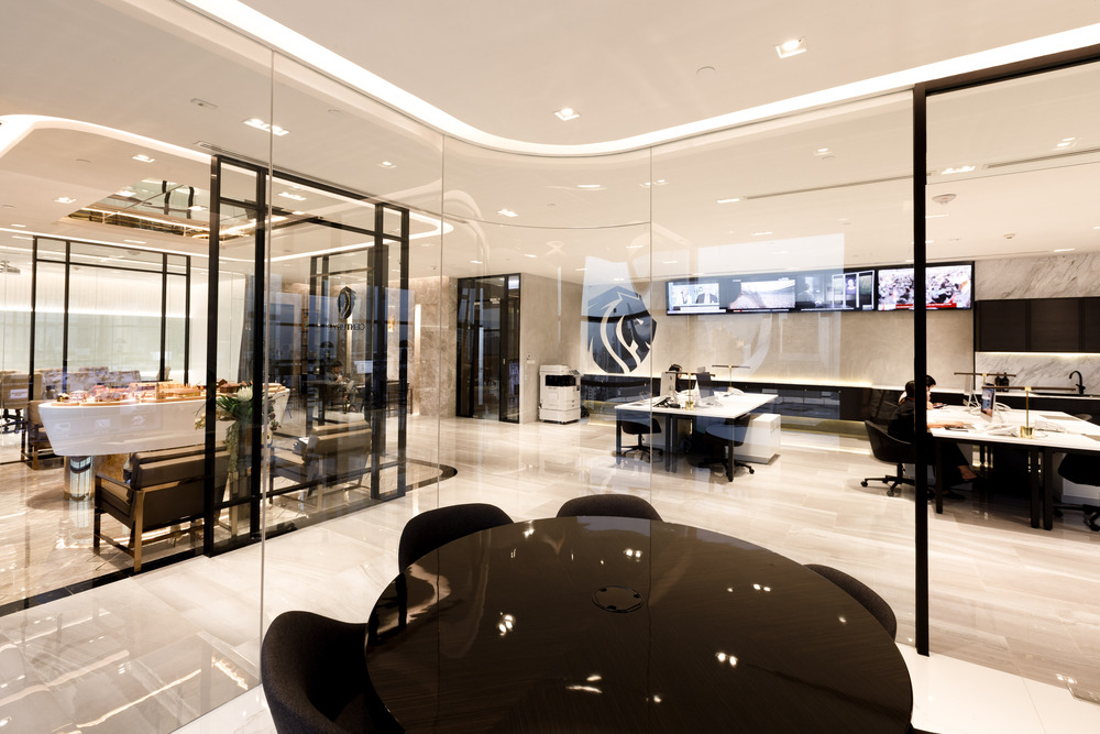 Attention to functionality was key in creating a high-performing workspace. Acoustic curtains in the foam meeting room ensure confidentiality for investor discussions, while concealed storage solutions maintain a clean, uncluttered look. State-of-the-art multimedia systems in the showcase area enhance presentations and client engagement.