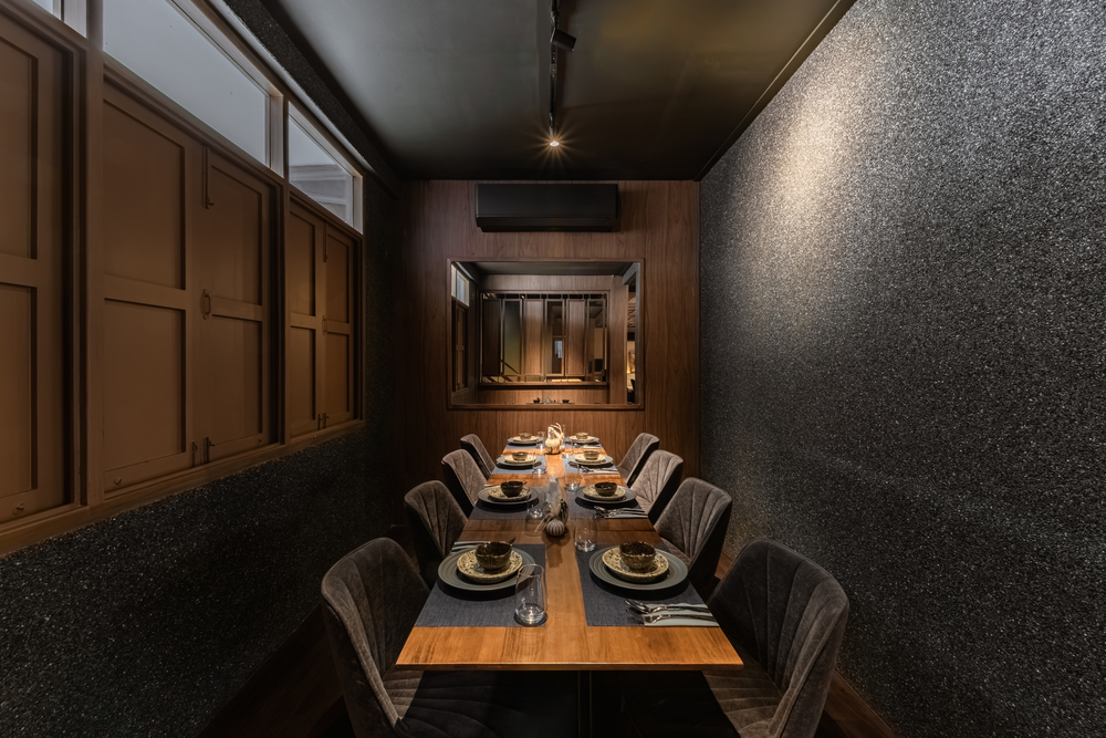The private dining areas are intimate sanctuaries where the interplay of textures becomes even more pronounced. Velvet-upholstered seating, dark-toned wood, and subtle lighting cast a warm, golden glow, enhancing the experience of sharing meals and stories. The vintage wooden window shutters remain untouched, framing the space with whispers of its history.