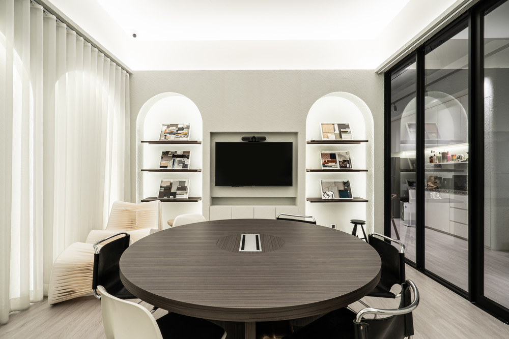 The journey into the studio begins with the front-facing meeting room, a deliberate decision inspired by Feng Shui principles. This space anchors the office with energy and purpose. At its heart lies a custom-designed round table, a shape that represents unity, equality, and balance. It is here where ideas flow freely, where designers, partners, and clients sit as one team, each voice equal, every perspective valued. This single table reflects how we approach design: with collaboration, openness, and a shared goal of creating exceptional spaces.