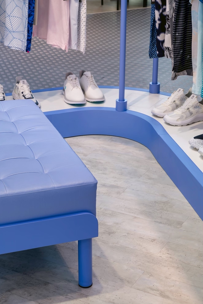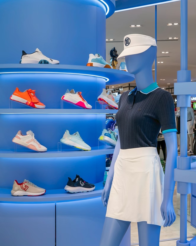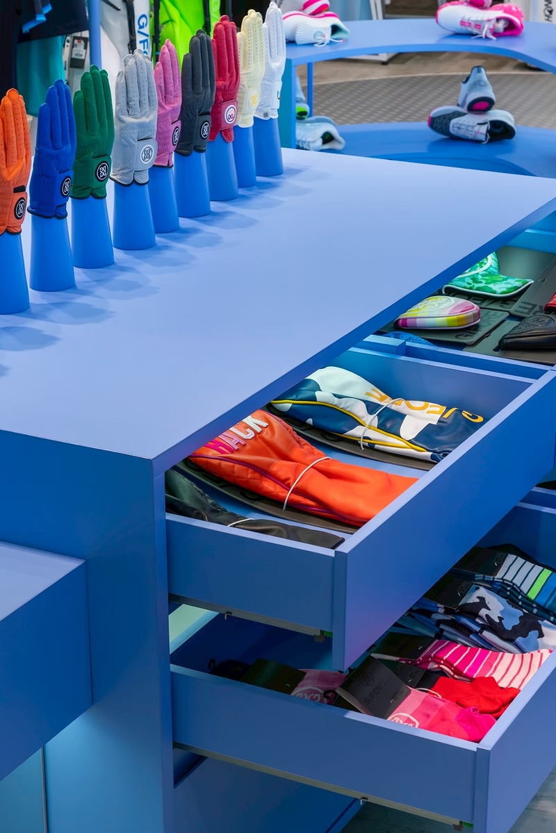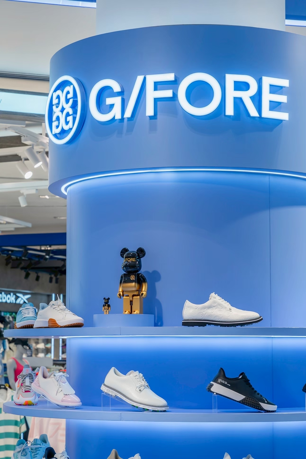 The space embraces a dynamic palette of G/FORE’s signature blue, complemented by sleek lines and reflective surfaces that amplify light and openness. Carefully designed displays showcase the brand’s wide range of performance-driven footwear, apparel, and accessories, turning every product into a statement piece.