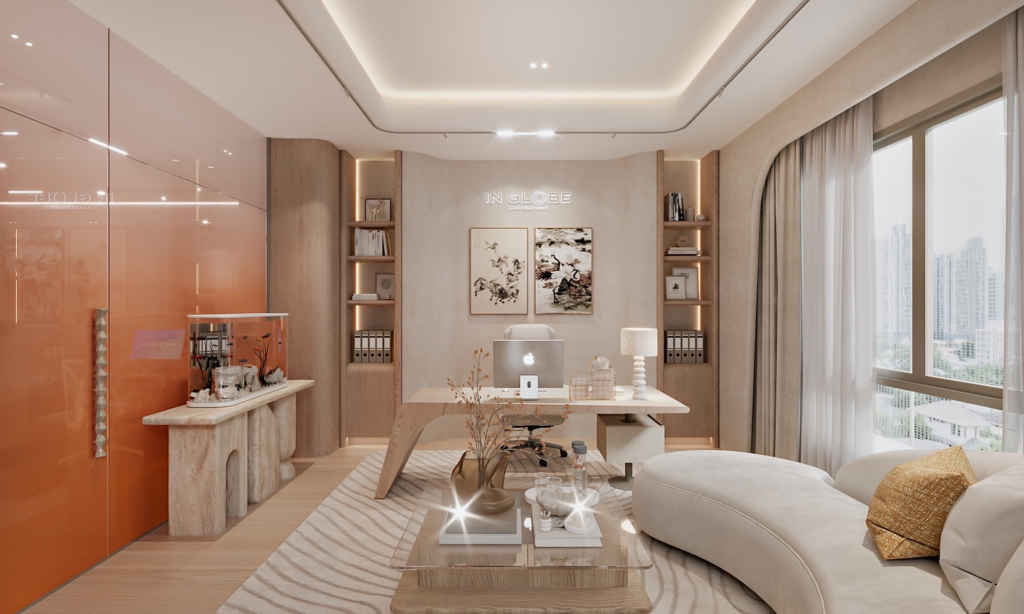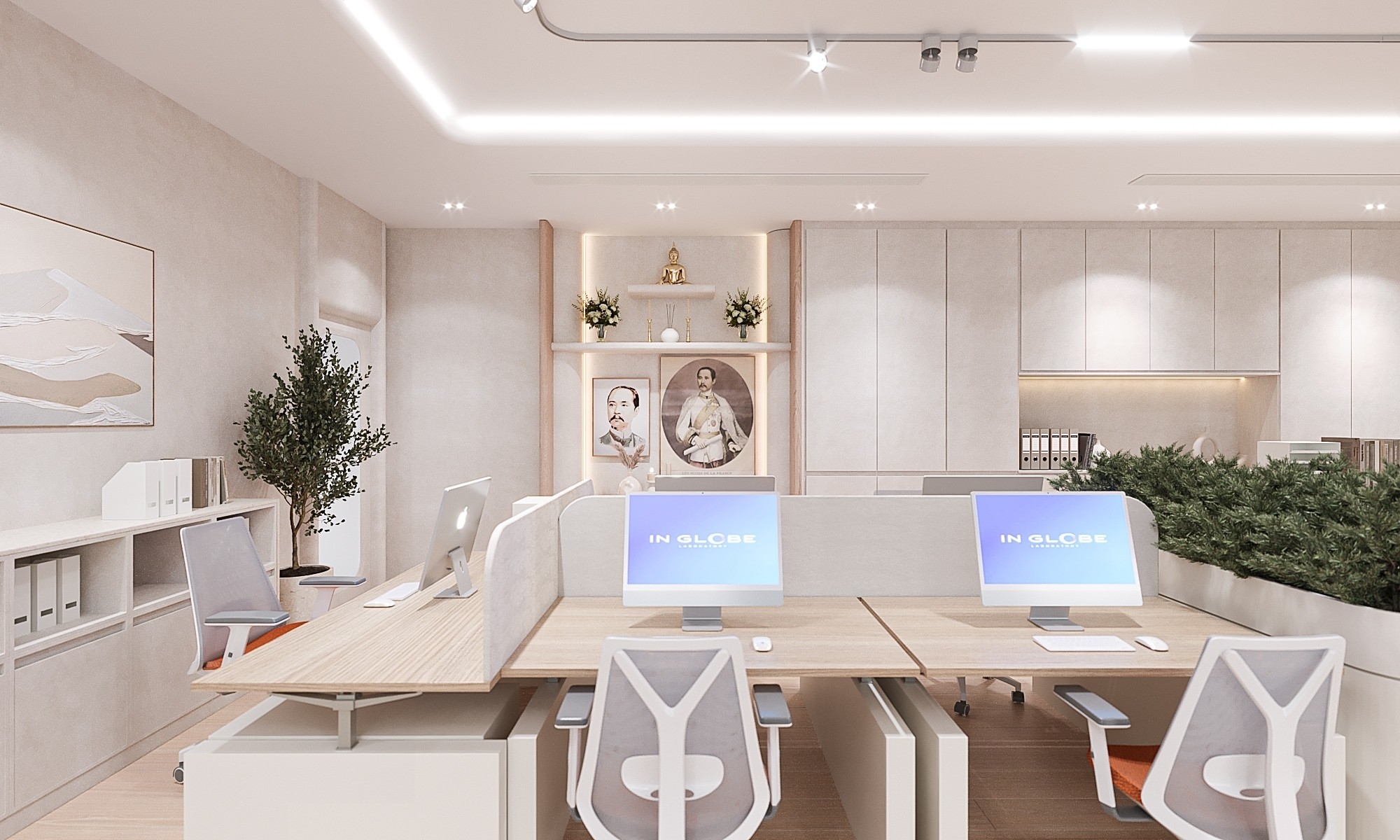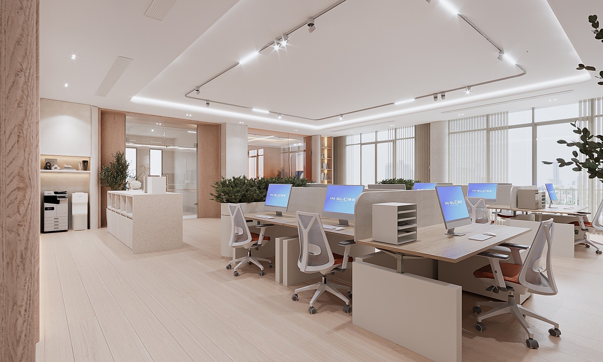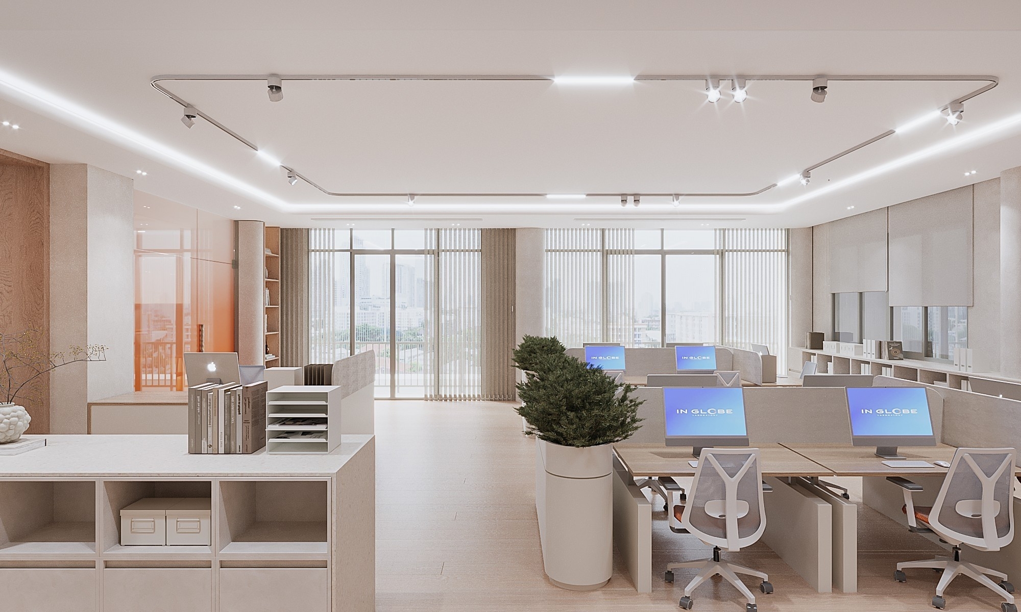 A soft neutral palette sets the tone, paired with natural wood textures, glass partitions, and curated greenery that add warmth and balance. Modern furnishings, marble meeting tables, and refined lighting fixtures enhance the sense of sophistication, while integrated storage keeps the workspace clean and organized.