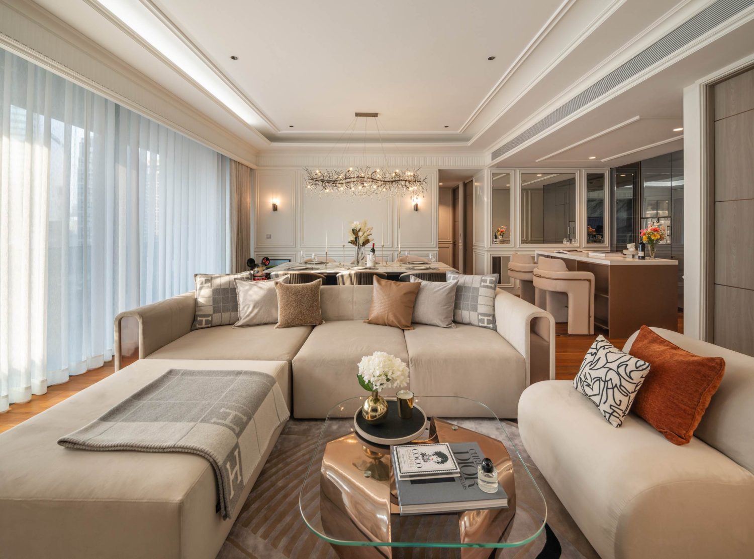 • Living Room: A centerpiece of soft sophistication, featuring plush custom seating, elegant neutral tones, and layered lighting for a cozy yet elevated ambiance.