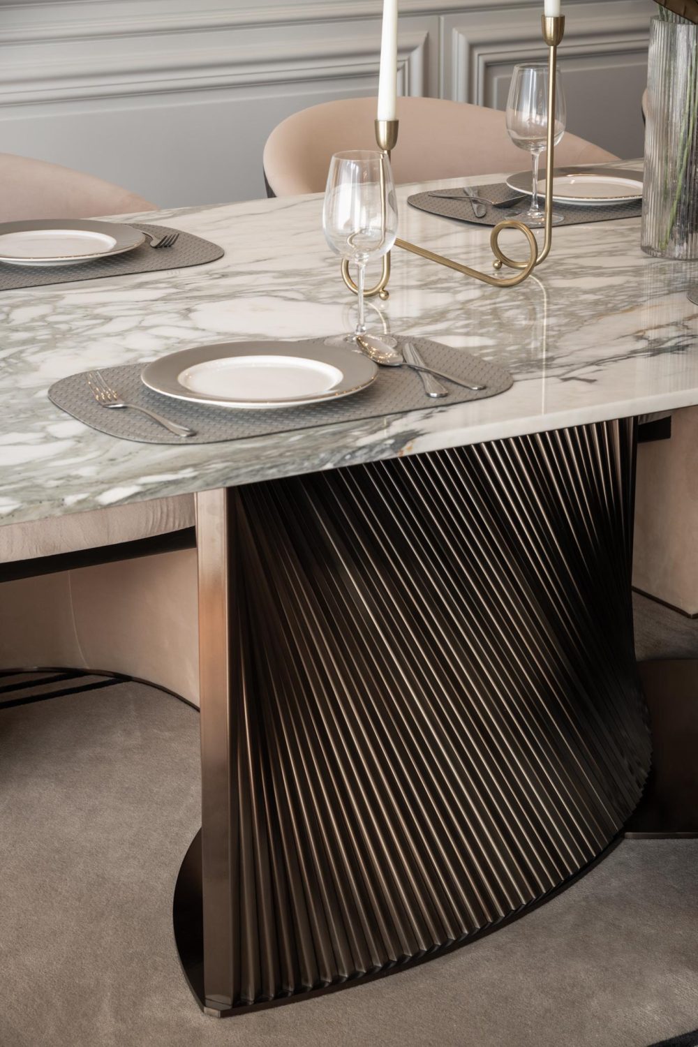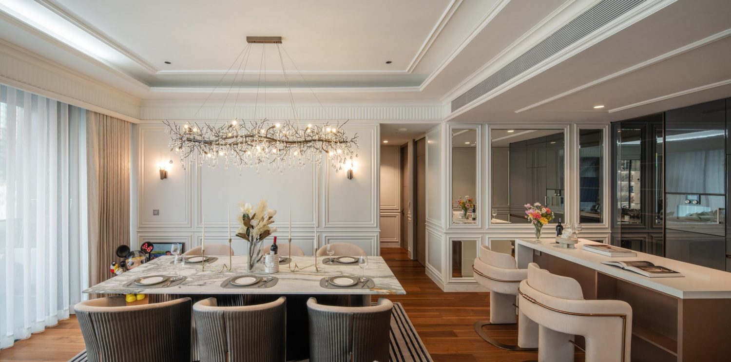 • Dining Area: Highlighted by a sculptural marble dining table and an artistic chandelier inspired by organic forms, the space is designed for refined gatherings.