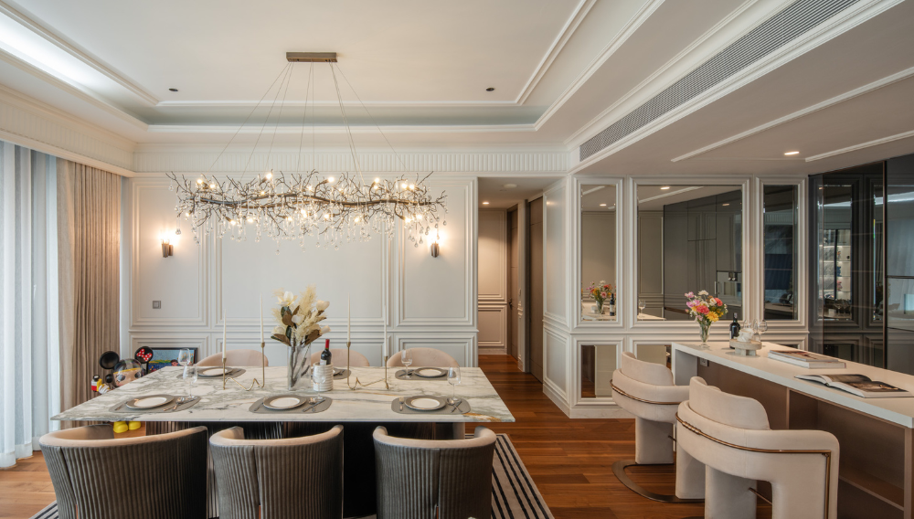 • Dining Area: Highlighted by a sculptural marble dining table and an artistic chandelier inspired by organic forms, the space is designed for refined gatherings.