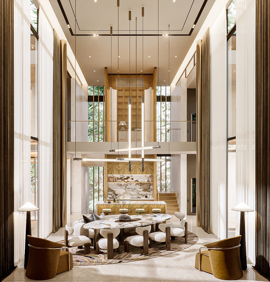 The spatial planning connects all key areas seamlessly, from the grand double height living space and refined dining area to private family lounges, cozy children’s rooms, and open outdoor retreats. Each zone is thoughtfully defined yet visually connected, allowing for smooth circulation while maximizing natural light and enhancing the sense of openness throughout the home.
