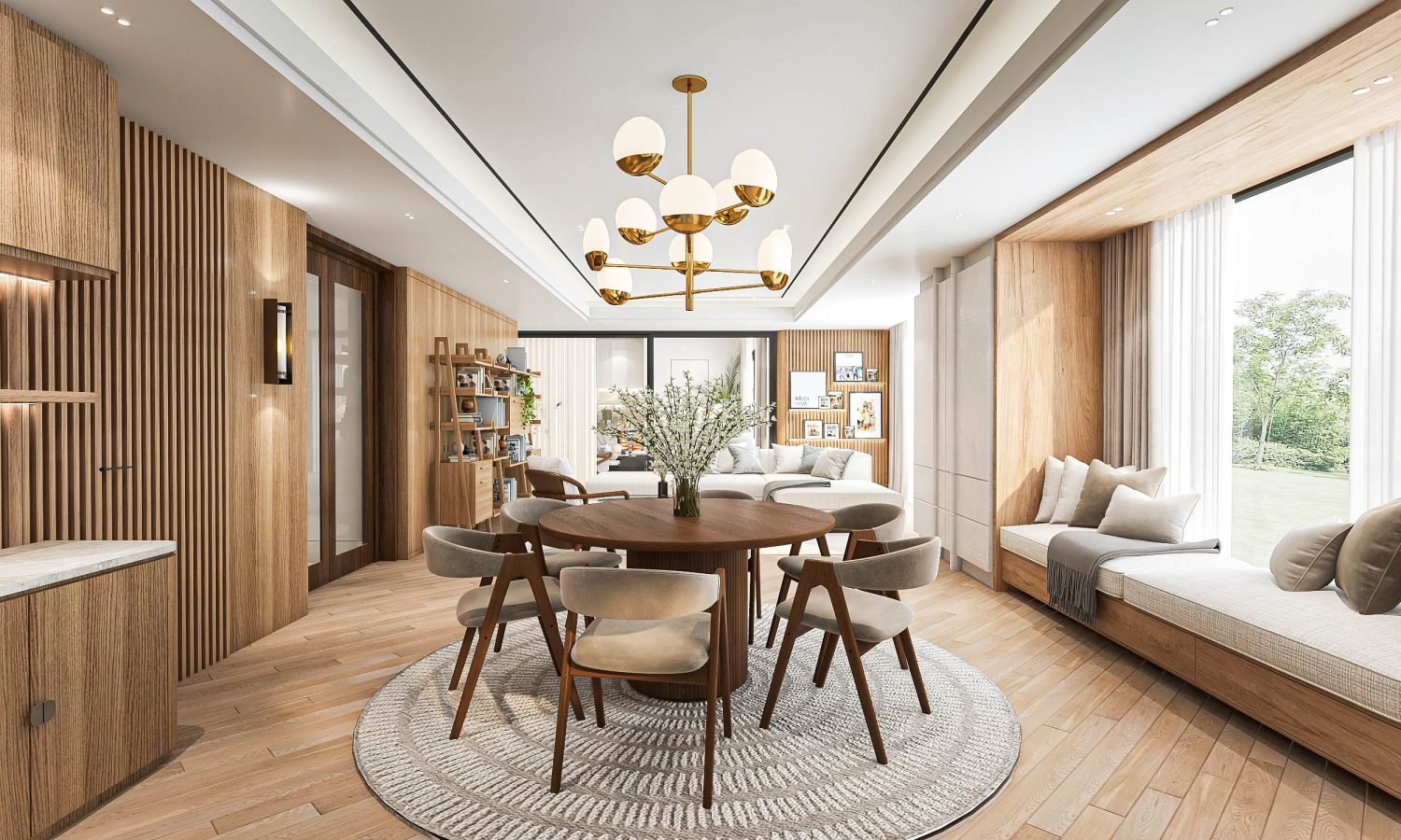 A soft neutral palette sets the tone, layered with warm wood textures, natural stone finishes, and carefully curated furnishings that bring depth and balance. Bespoke cabinetry and integrated storage ensure a clean, uncluttered environment, while sculptural marble dining tables, organic textiles, and elegant accents elevate the overall aesthetic.