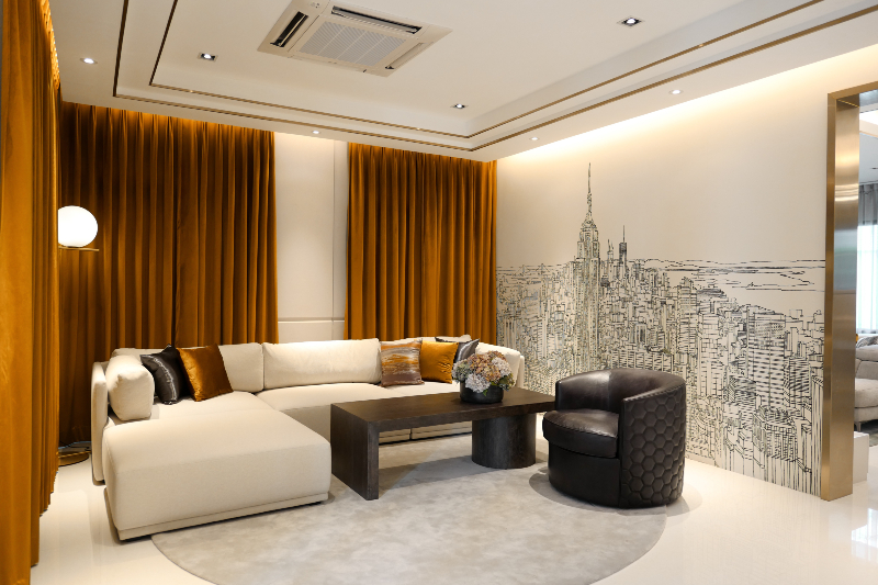 Nestled in the heart of Bangkok, K. Pornpon’s residence by Double V Space embodies a refined approach to modern luxury living. The design highlights a seamless balance between sophistication and comfort, with warm golden accents paired elegantly against soft neutral tones. Expansive velvet drapery frames the space, enhancing the natural light while adding a sense of depth and intimacy to the interior.