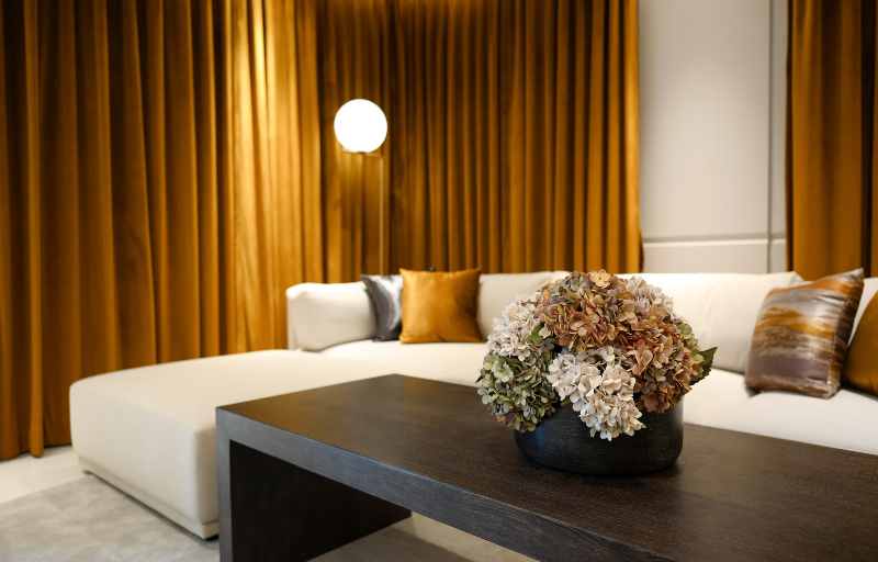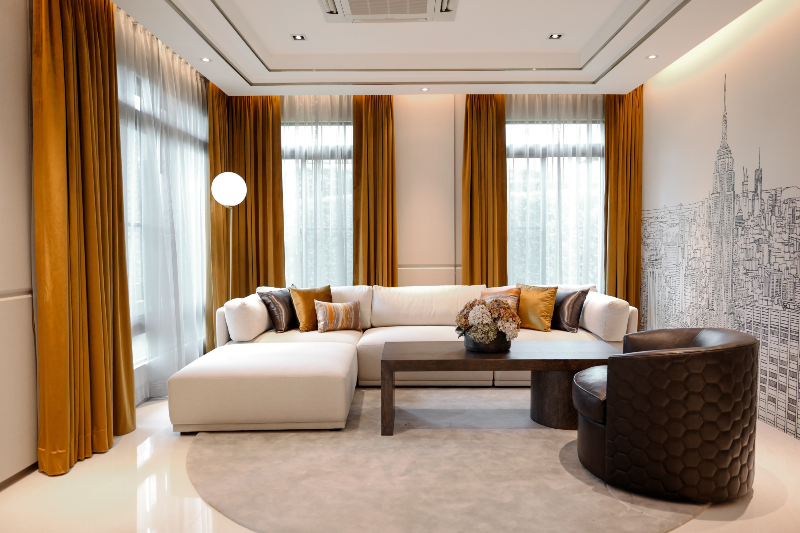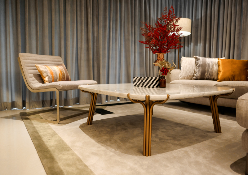 Every element has been thoughtfully curated to achieve harmony and flow. Bespoke furniture pieces, crafted with meticulous attention to detail, integrate effortlessly into the layout, creating both function and visual cohesion. The living area becomes a focal point, with its plush seating, layered textures, and accent cushions that introduce subtle pops of color, a perfect blend of elegance and personality.
