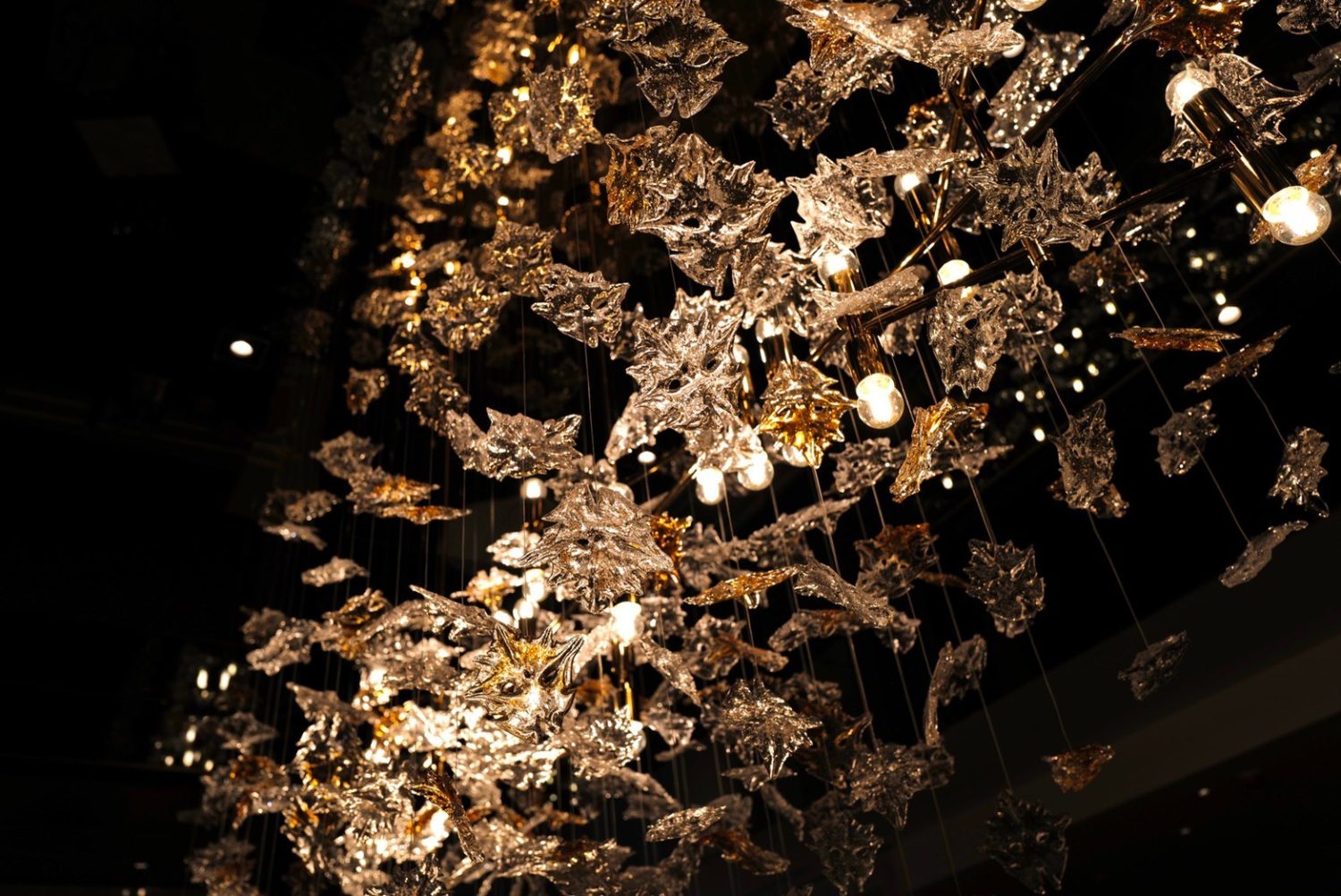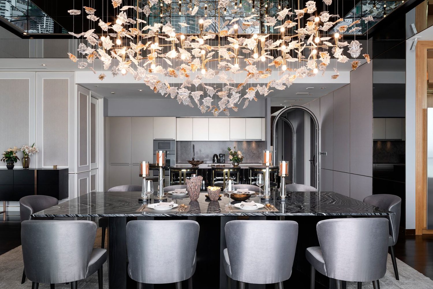 A cascading chandelier installation forms the centerpiece of the residence. Its intricate composition of glass leaves and warm lighting creates a floating sculpture that radiates understated opulence.