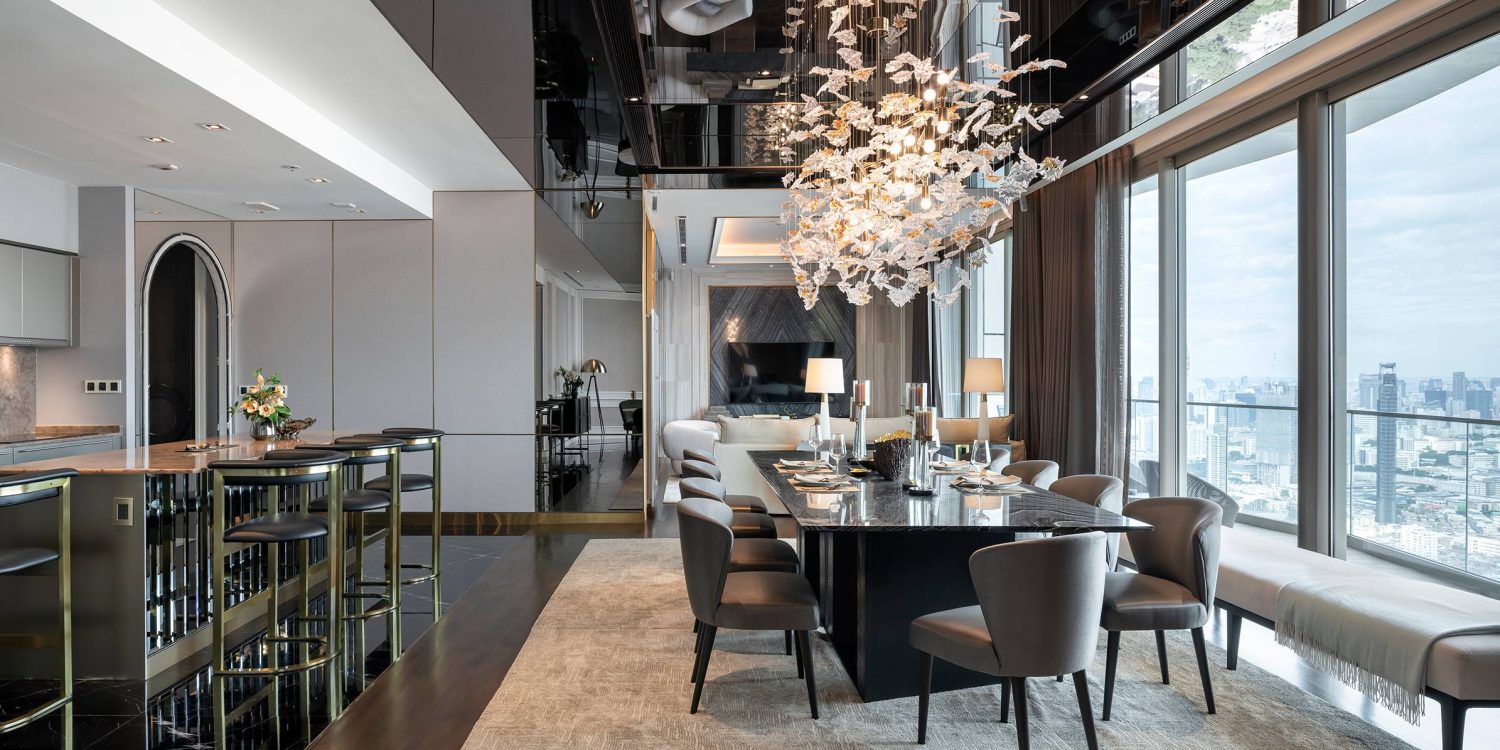 The seamless flow between living, dining, and kitchen areas maximizes openness and natural light. Expansive floor-to-ceiling windows frame uninterrupted skyline views, connecting the interiors with Bangkok’s vibrant energy.