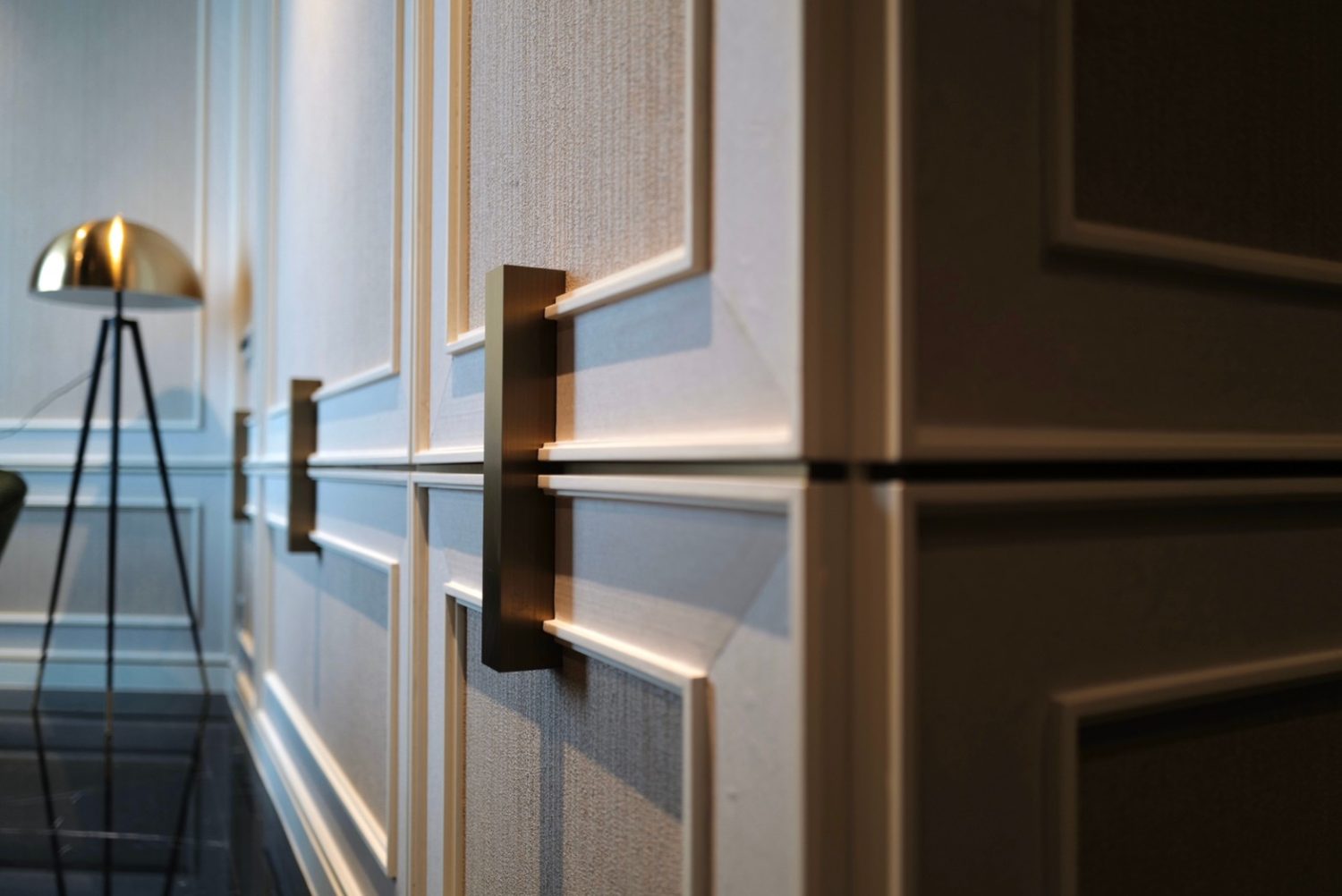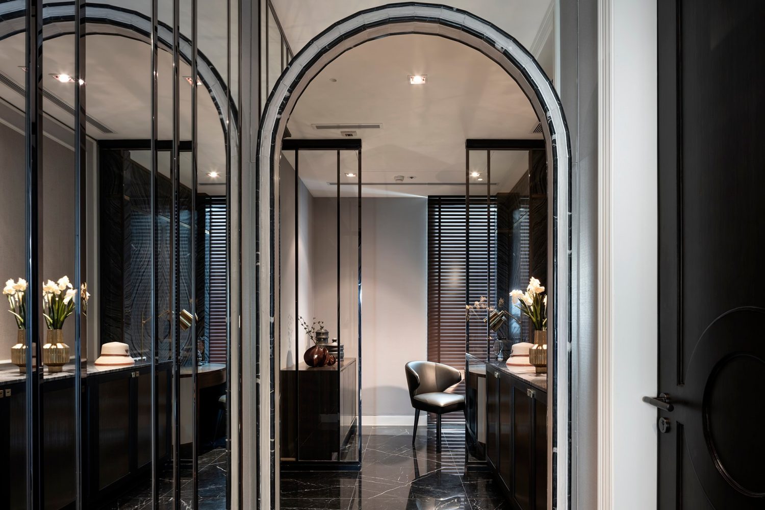 Black marble surfaces, brushed gold trims, and velvet upholstery are paired with elegant wall paneling to create a sophisticated, layered aesthetic. These details infuse warmth and character while maintaining a contemporary atmosphere.
