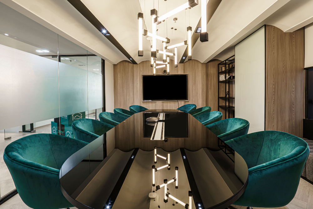 In the formal meeting room, the ceiling takes center stage. Incurved shapes were sculpted to mimic cloud formations, constructed from precision-cut gypsum board to create a fluid, seamless look. Beyond aesthetics, the cloud ceiling improves acoustics, ensuring clear communication during discussions. Integrated linear LED lighting adds soft illumination, reducing harsh shadows and creating a focused yet relaxed atmosphere.