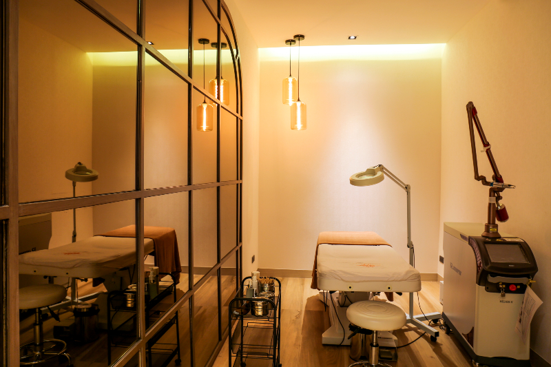 Each space is crafted with purpose. The treatment rooms are designed as tranquil cocoons where privacy and comfort take center stage. Soft, neutral palettes, complemented by layered lighting techniques, create a calm and inviting environment. Indirect lighting adds a touch of elegance, ensuring the space feels soothing while enabling the precision required for treatments.
