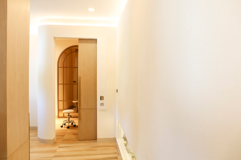 The journey begins with fluid curved lines and archways that gently guide clients through the space. These architectural details not only soften the overall environment but also evoke a sense of calm and flow. The extensive use of natural oak wood wraps the clinic in warmth and sophistication, providing a welcoming ambiance that feels both luxurious and approachable.