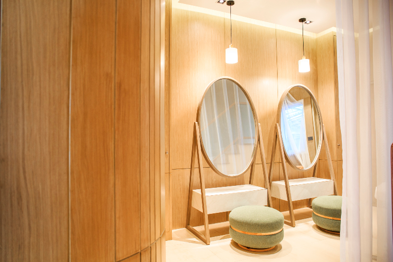 The Powder Room reflects thoughtful design and attention to detail. It features custom circular mirrors framed by light oak, marble vanities, and carefully upholstered stools in calming green tones. This space is not just functional but also elevates the post-treatment experience, allowing clients to refresh and reconnect before stepping back into their day.