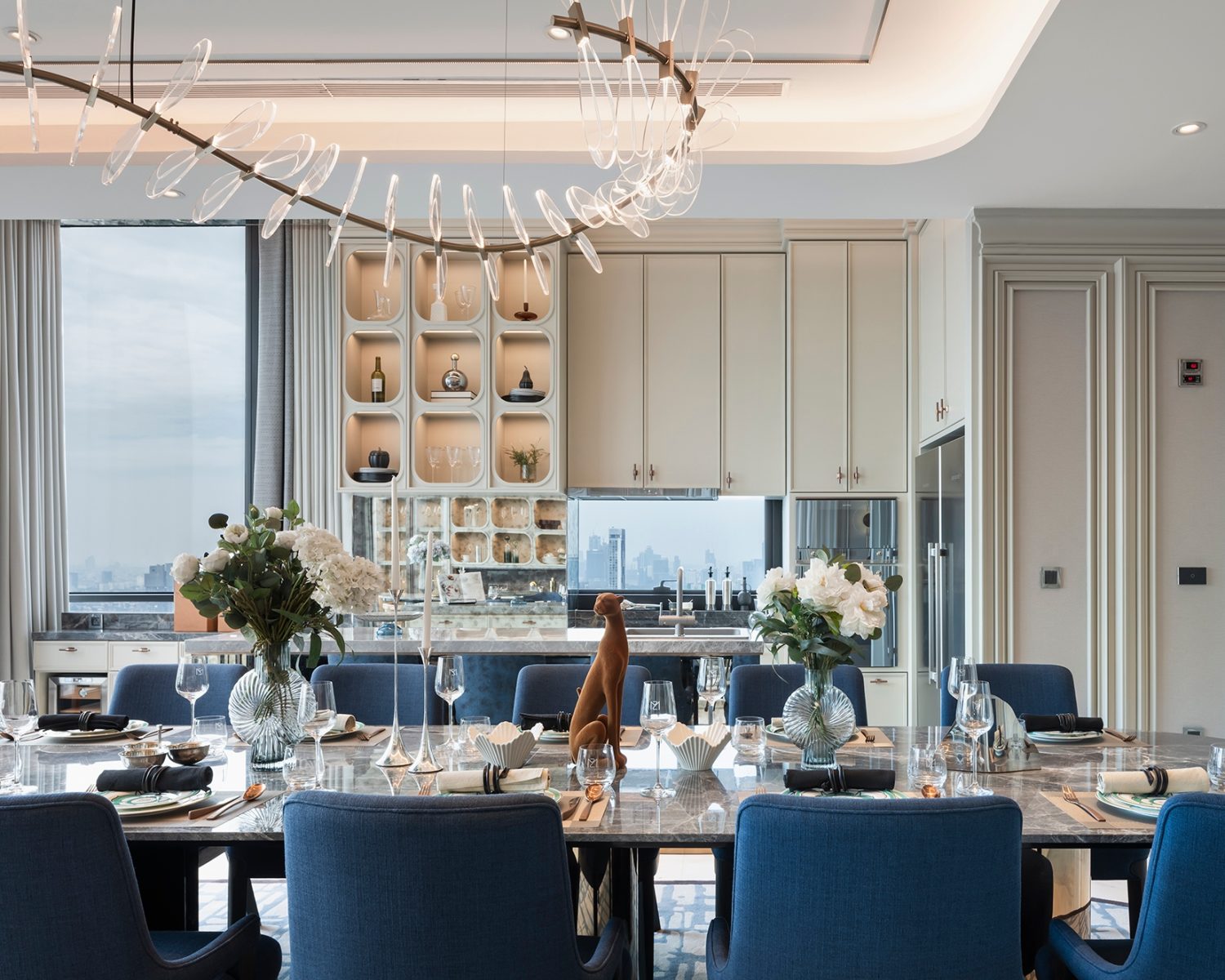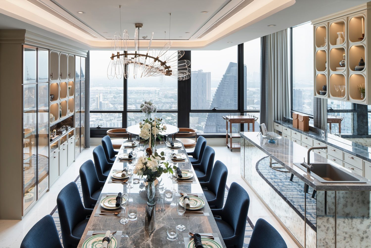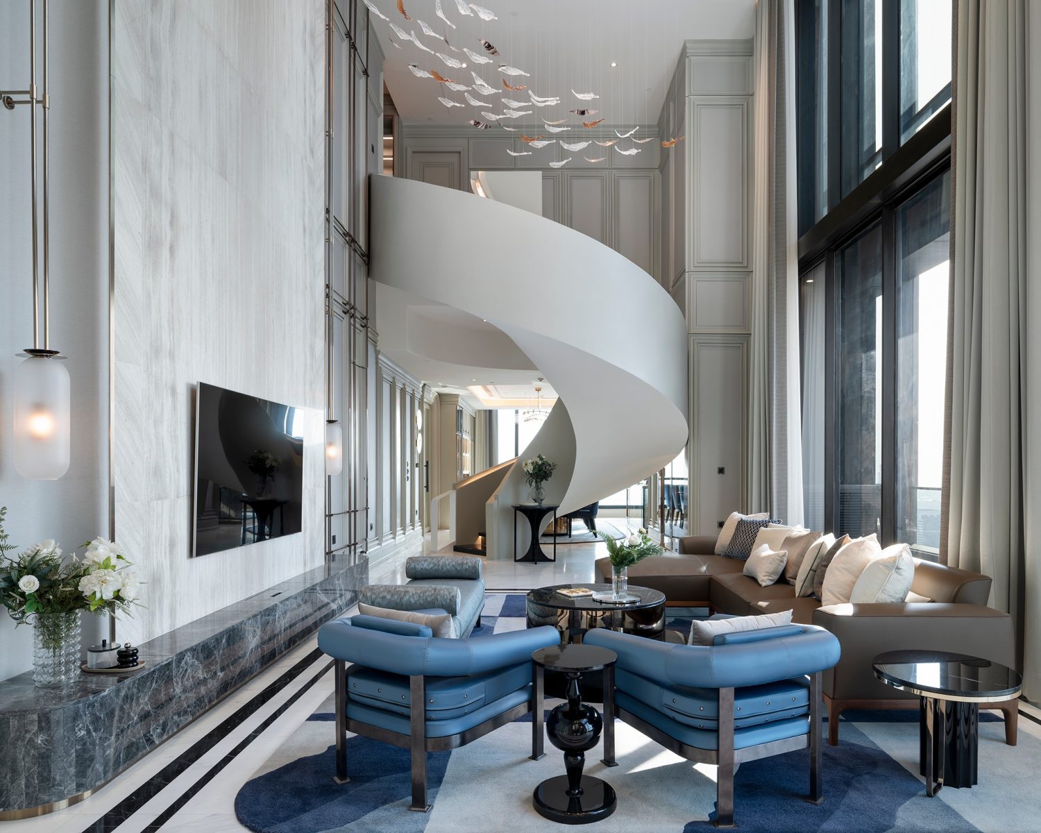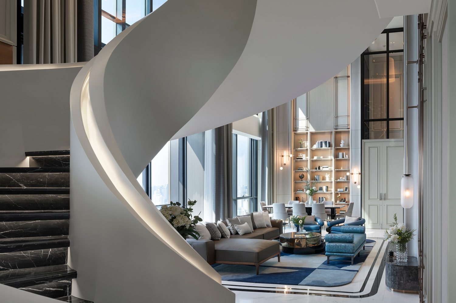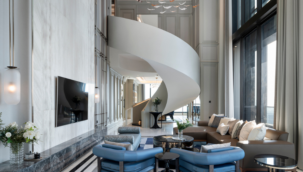 At the heart of the design is the sculptural spiral staircase, a custom centerpiece that embodies both artistry and engineering. Beyond its function, the staircase defines the visual identity of the penthouse, gracefully connecting the two levels while enhancing its sense of scale and drama.