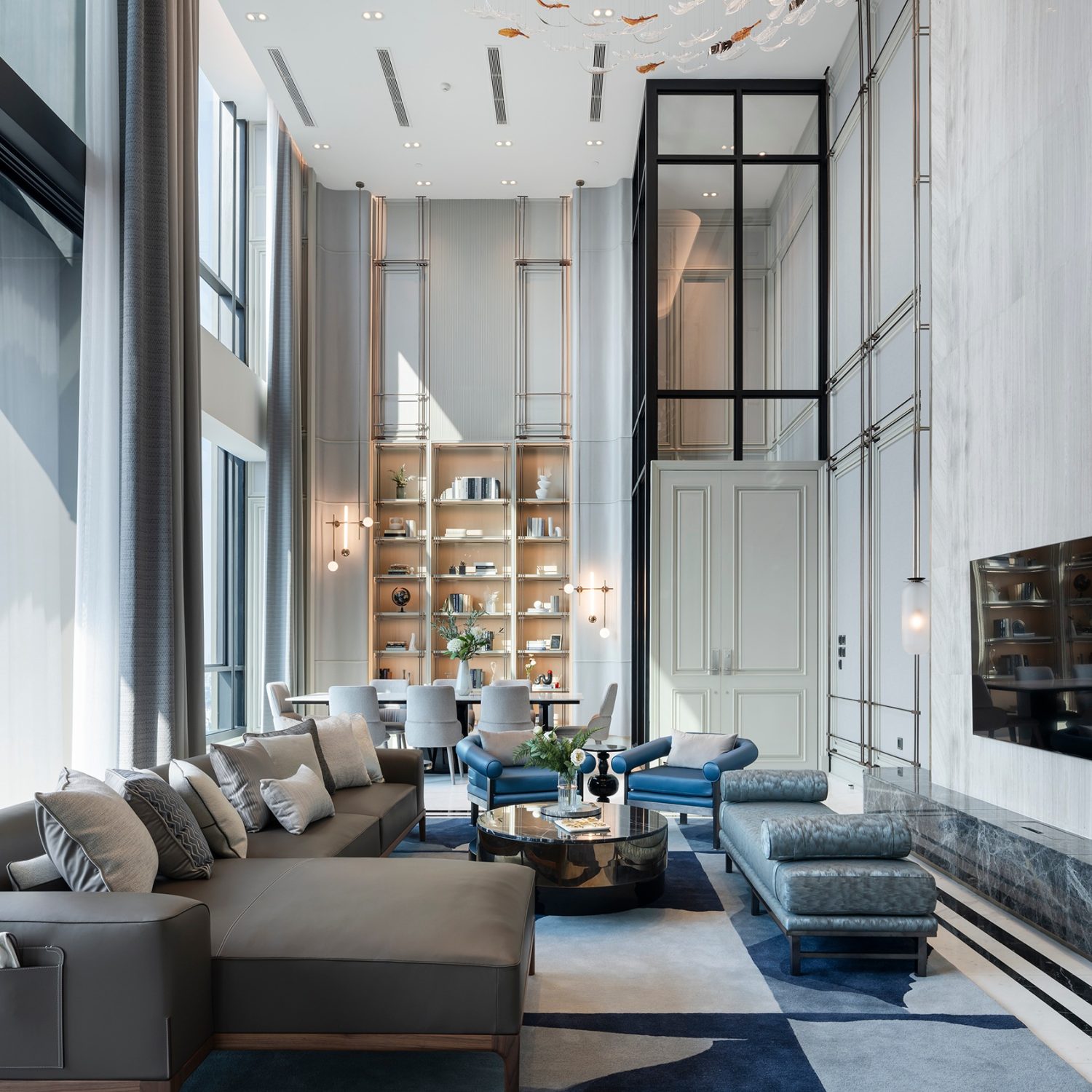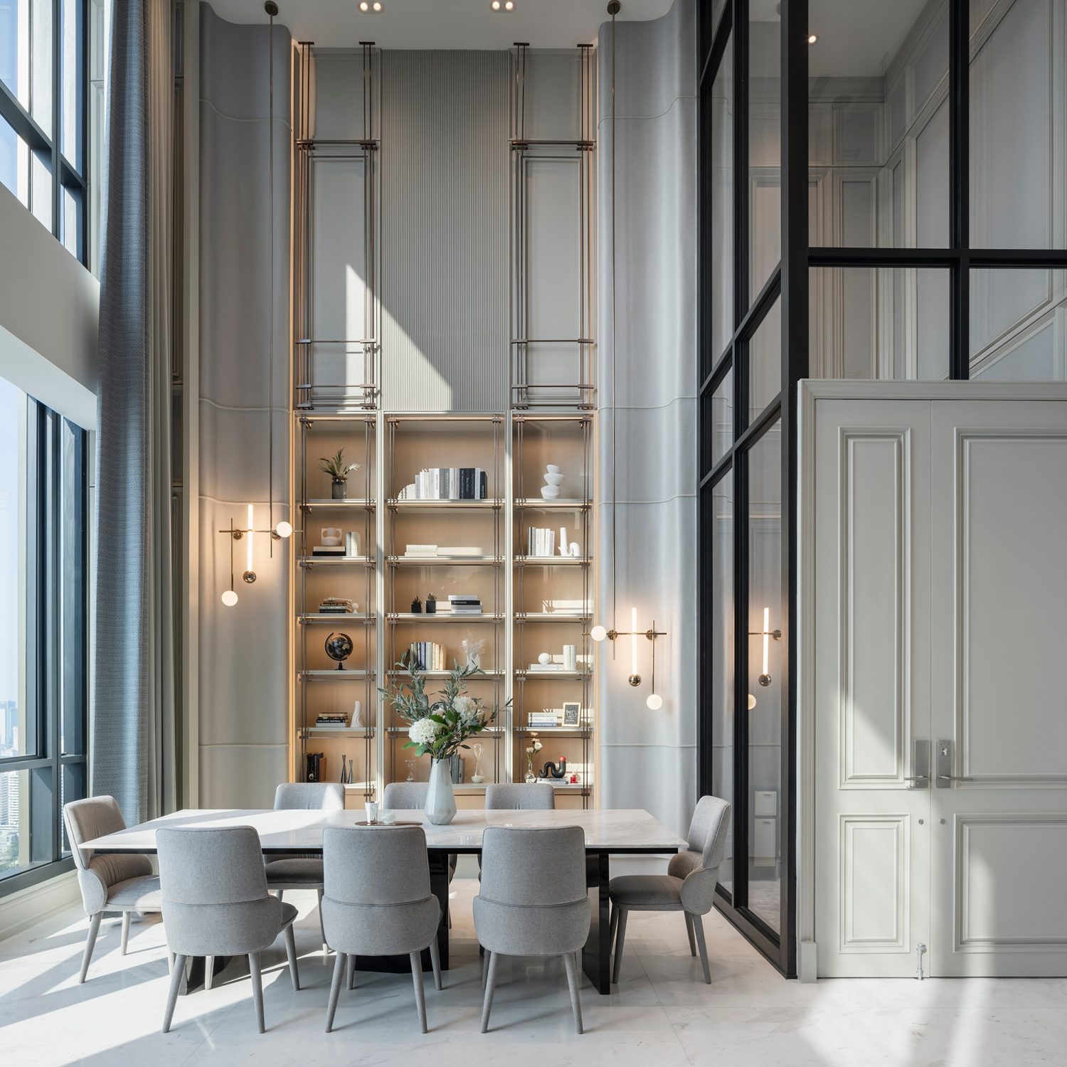 Nestled in the vibrant heart of Bangkok, The Esse Thonglor is a 252 m² duplex penthouse located on Sukhumvit Soi 36, a true statement of modern luxury. With its soaring 7-meter ceiling height, this residence provided Double V Space with the perfect opportunity to craft an interior that seamlessly blends architectural innovation, refined aesthetics, and bespoke detailing.